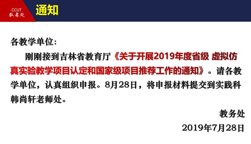按照《关于做好2017-2020年示范性虚拟仿真实验教学项目建设工作的通知》(吉教高字〔2017〕43号)要求,对照《2019年度示范性虚拟仿真实验教学项目认定计划及对应专业表》(见附件2),2019年度我厅拟认定一批省级虚拟仿真实验教学项目,并择优推荐31个项目参加教育部示范性虚拟仿真实验教学项目认定工作。