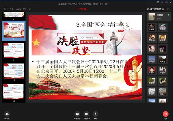 2020年党政工作要点》中“科学谋划未来发展,加快推进特色高水平应用研究型大学建设”的有关要求,贯彻思想大讨论动员研讨会精神,6月3日下午,学院全体教师通过企业微信进行了线上专题学习。学习会由党委书记李奇涵主持。