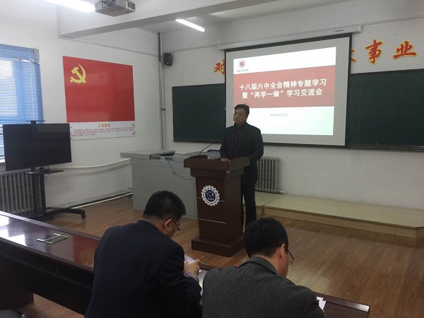 党委十八届六中全会精神专题学习暨“两学一做”学习交流会在学院会议室举行。学院党政领导、各系支部书记、主任及全体党员参加了大会。大会由学院党委副书记胡刃锋主持。
