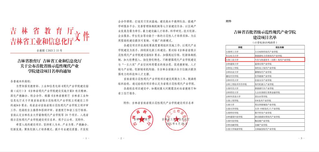 本网讯(通讯员 李迎春 谷东伟)6月29日,吉林省教育厅、吉林省工业和信息化厅下发了《关于公布首批省级示范性现代产业学院立项建设名单的通知》(吉教联〔2021〕33号),由我院申报的汽车与轨道客车(旭阳)现代产业学院成为吉林省首批立项建设的20所省级示范性现代产业学院之一。