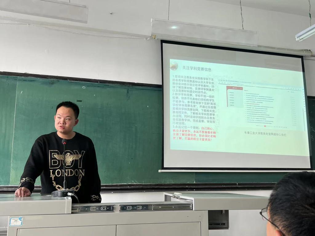 同日,智能制造工程系主任卢明明于主楼1592召开了学科竞赛交流分享会,大三同学李家成分享了学校认定的学科竞赛分类、特点以及竞赛时间等方面,大二同学梁宇辰分享了学科竞赛参赛注意事项、各项比赛的环节分类以及参赛意义等。