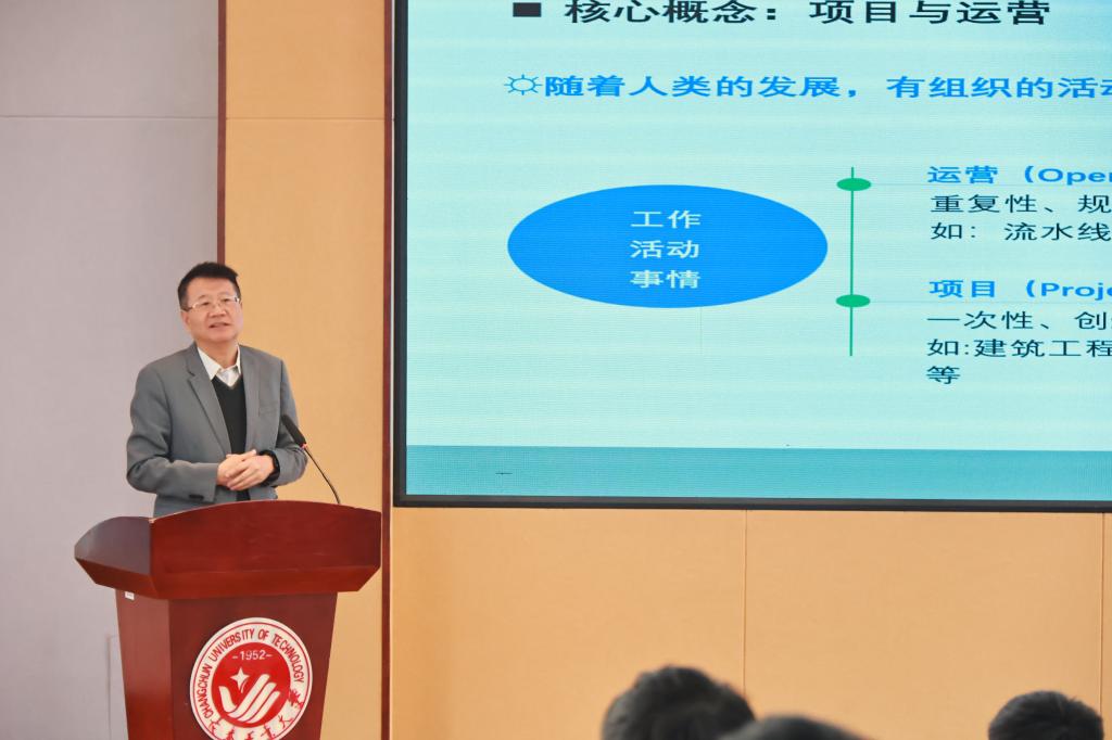 的学生做了国际项目管理精品课推介,他指出当今的职场需要专业人才,更需要“跨界”“融合”“复合”“国际”型人才,当代大学生应掌握系统的现代国际项目管理知识,通过学习获得的系统思维能力和系统做事能力可以助力大学生在职业生涯初期脱颖而出。他希望同学们能够系统地学习国际项目经理资质认证体系中的“项目管理知识体系”,通过课程学习,形成与之相应的战略思维、经营思维和项目思维,储备基本的项目管理技能,能在学习、生活、工作中主动应用项目管理知识、积累经验、锻炼技能、培育能力,为进入职场后的进一步提升、拓展打下坚实的基础。