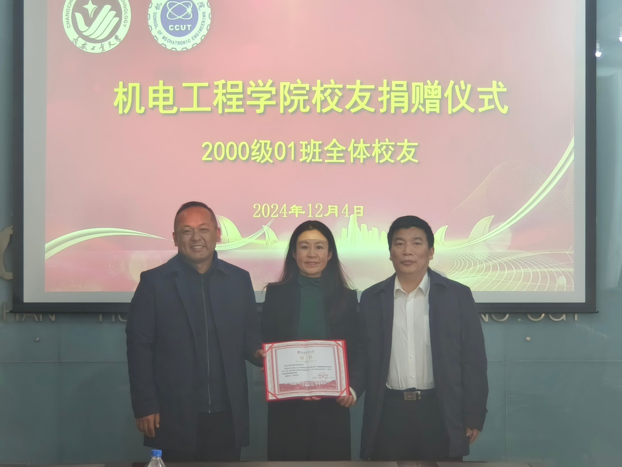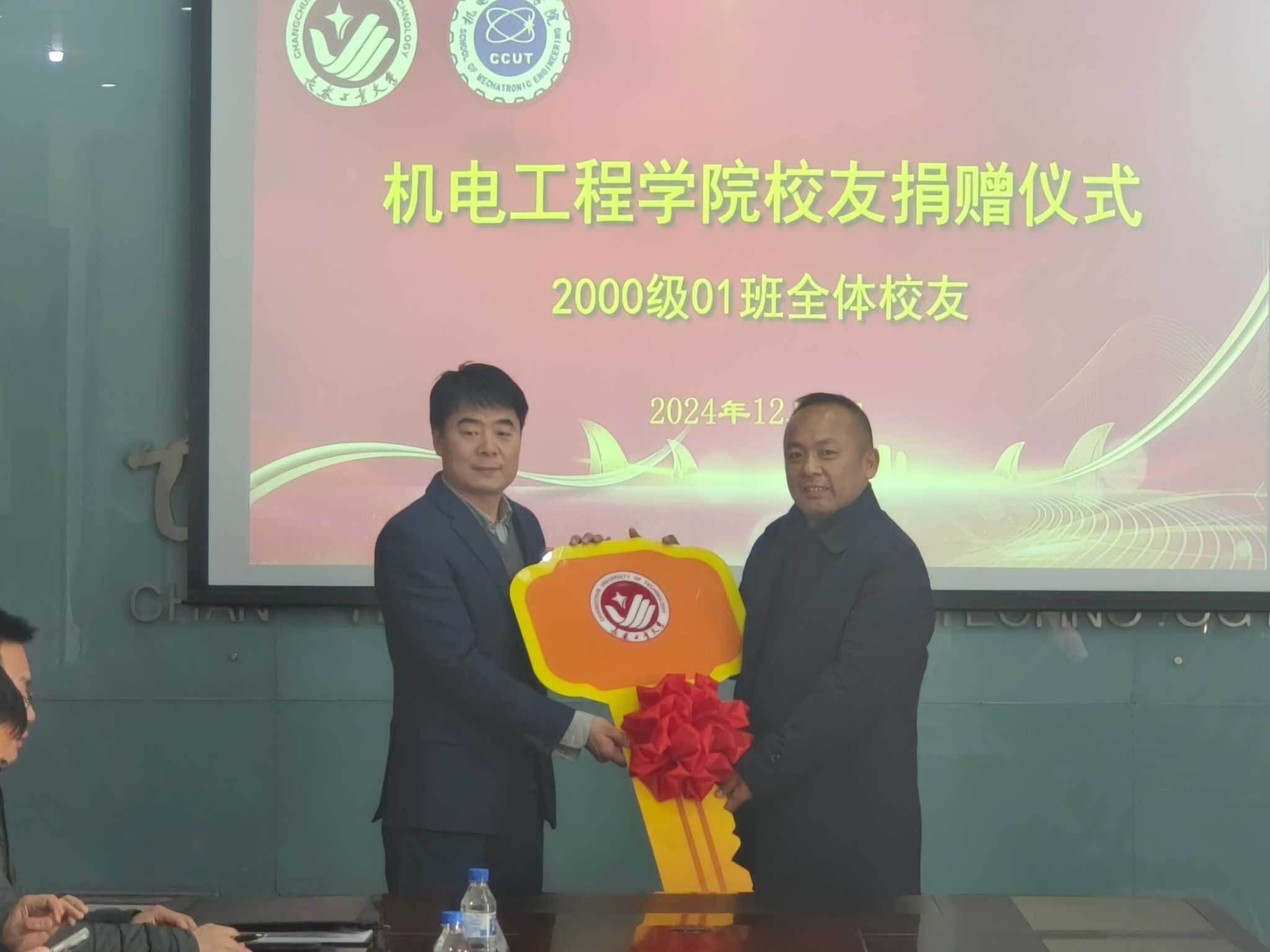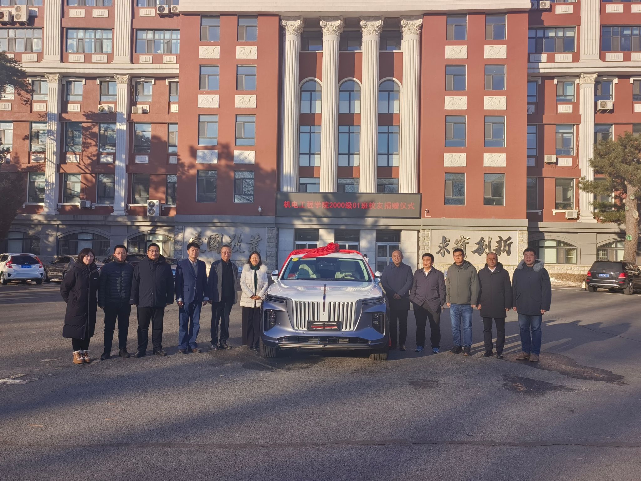 2000级01班校友代表中国第一汽车股份有限公司整车试验高级主任刘占国、底盘试验主任王长明、学校党委副书记李东玲、校友办副主任郑洪斌、学院党委书记张利军、院长郝兆朋、学院党委副书记杨楠、副院长谷东伟、副院长卢明明、机械工程系主任高嵩参加了捐赠仪式,仪式由张利军主持。