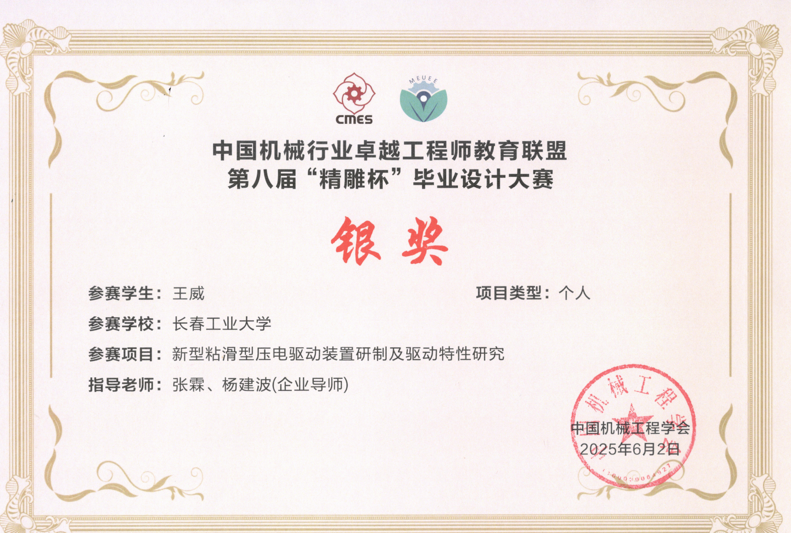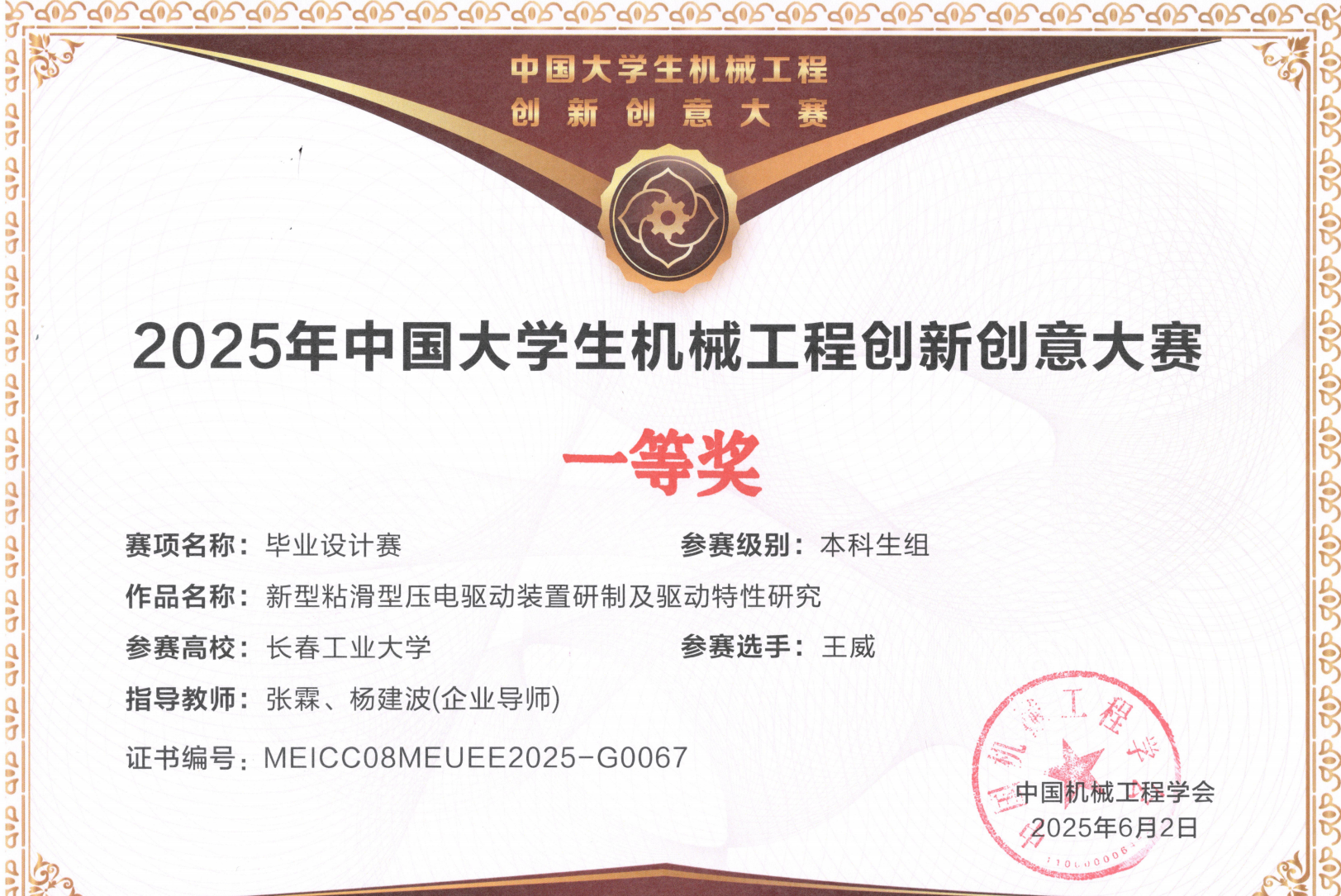 王威同学的作品《新型粘滑型压电驱动装置研制及驱动特性研究》(指导教师:张霖、杨建波)荣获个人赛银奖(全国一等奖)。