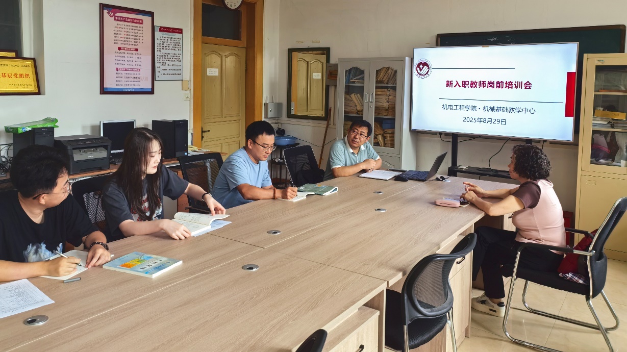 本网讯(通讯员 刘小勇)8月29日,为了加强教师队伍建设,提升新入职教师教学能力与师德修养,帮助新教师快速转变角色,在2025级新生开课前,学院为新入职即将讲授《工程制图》课程的教师开展了“走上讲台”前为期一个月的系统性培训活动。培训会在课程所在部门机械基础教学中心举行。会议由中心主任刘小勇主持,《工程制图》课程负责人陶金老师、李会杰老师参会。两位课程负责人针对《工程制图》课程的具体课程特点、讲授内容、进度安排以及学生特点进行了详细的介绍,分享了各自的课堂教学经验,并制定了接下来一个月内的培训计划。