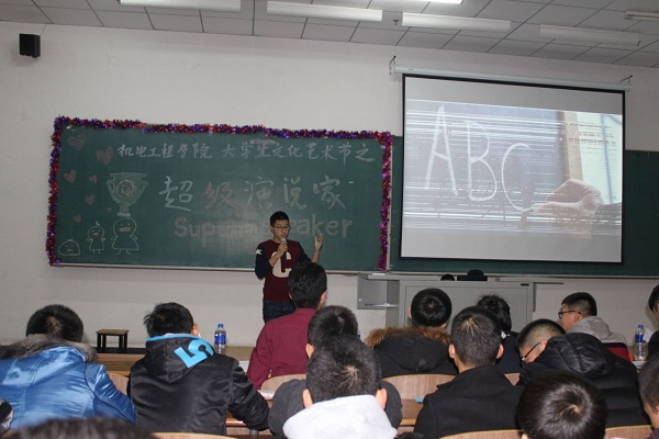 在北湖校区举办了大学生文化节系列活动之“超级演说家“英语演讲比赛。学院四大联合会主要学生干部和16级全体学生参加了活动。